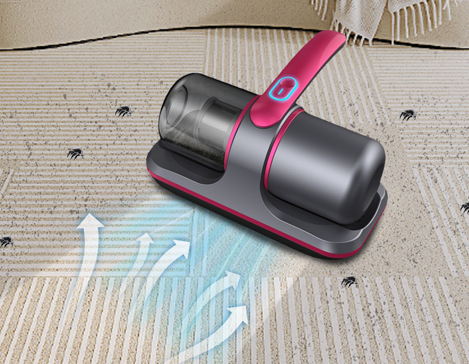 The Meacode mite-removing vacuum features an advanced cyclonic filtration system. As it operates, a powerful vortex of high-speed air spins inside the dustbin, creating a strong centrifugal force that efficiently separates dust, hair, and particles and forces them to settle against the bin's walls. This process ensures the filter remains unclogged and the suction power consistently stays in its optimal state.
